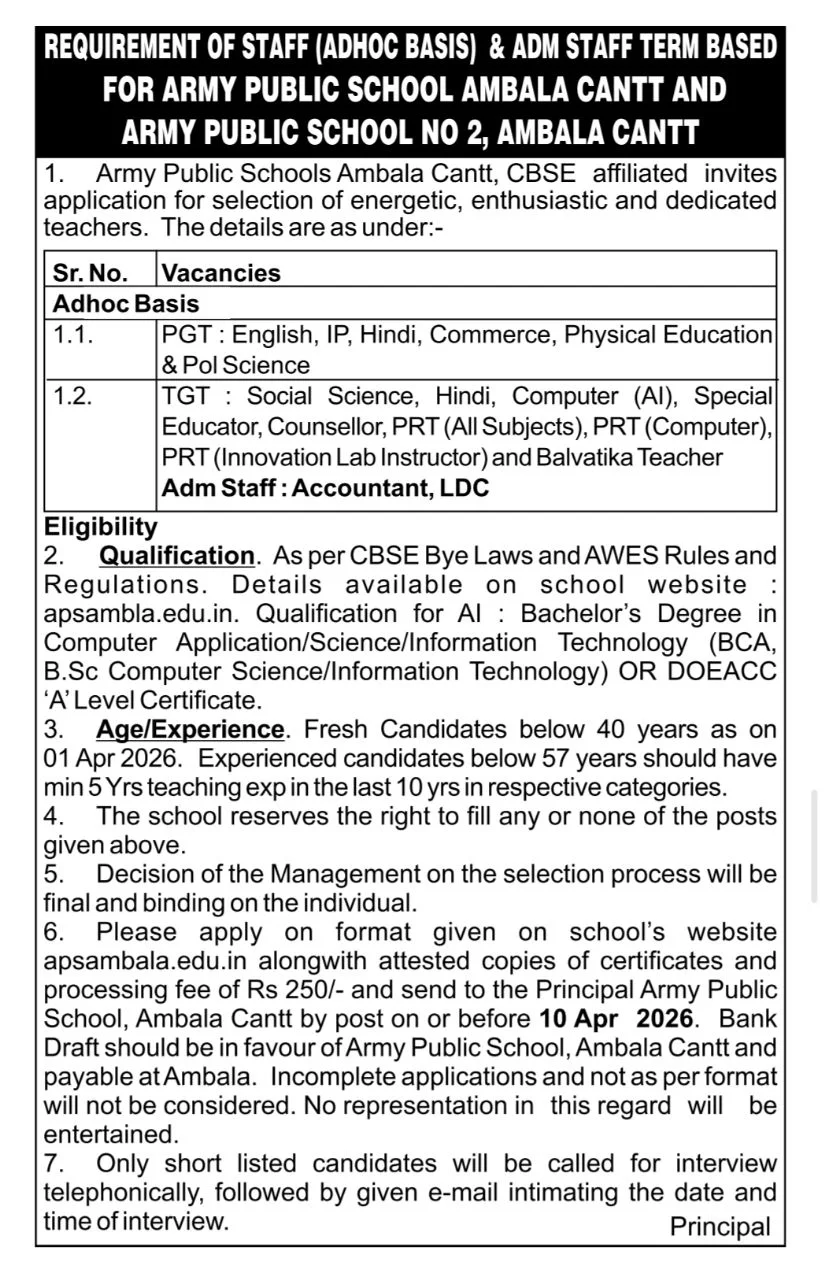Army Public School Ambala Cantt की तरफ से Adhoc Basis और ADM Staff के पदों पर भर्ती का नोटिफिकेशन जारी किया गया है. इस भर्ती के तहत विभिन्न टीचिंग और नॉन-टीचिंग पदों पर भर्ती की जाएगी. इच्छुक उम्मीदवार इस भर्ती के लिए ऑफलाइन आवेदन कर सकते हैं. आवेदन की अंतिम तिथि 10 अप्रैल 2026 रखी गई है.
