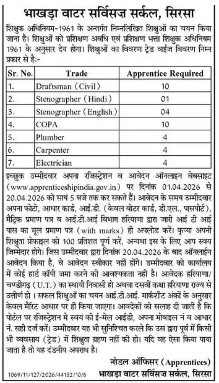 भाखड़ा वाटर सर्विसेज सर्कल, सिरसा द्वारा Apprentices Act 1961 के तहत विभिन्न ट्रेड में Apprentice भर्ती का नोटिफिकेशन जारी कर दिया गया है। इस भर्ती के तहत कुल 37 पदों पर योग्य उम्मीदवारों का चयन किया जाएगा। इच्छुक अभ्यर्थी 1 अप्रैल 2026 से 20 अप्रैल 2026 तक ऑनलाइन आवेदन कर सकते हैं।
