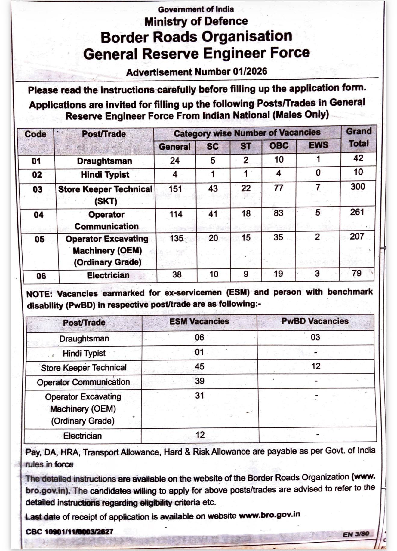 BRO Recruitment 2026: Border Roads Organisation (BRO) has released a new recruitment notification for various posts under Advertisement No. 01/2026. This notification was published in the Employment Newspaper (18–24 April 2026). A total of 899 vacancies are available for posts like Draughtsman, Hindi Typist, Store Keeper Technical, Operator, and Electrician.