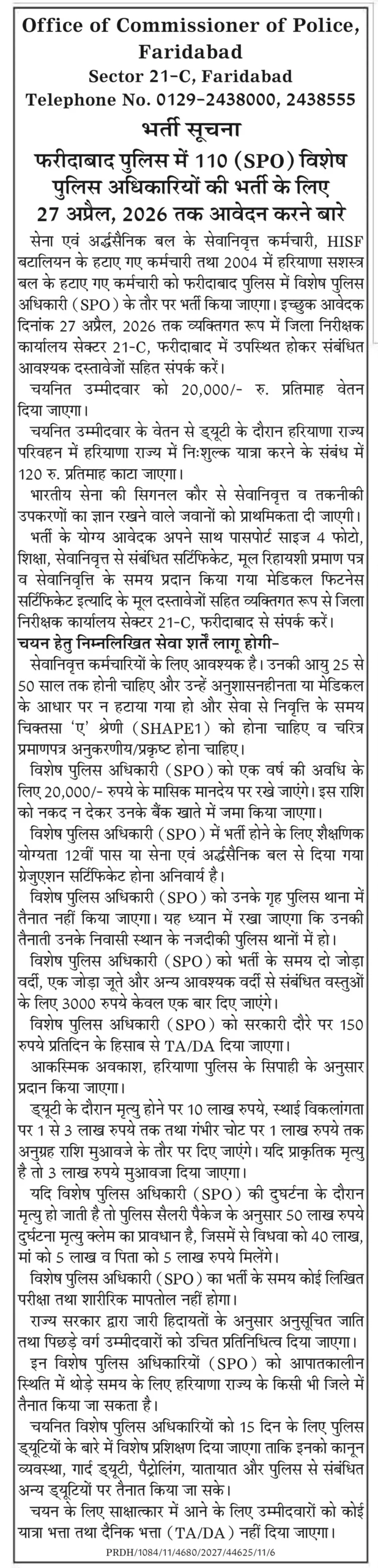 Faridabad Police SPO Recruitment 2026: Applications have been invited by the Office of Commissioner of Police, Faridabad for 110 posts of Special Police Officer (SPO). Interested candidates can apply offline till 27 April 2026 by visiting the office with required documents. This recruitment is mainly for ex-servicemen candidates. All important details are given below.
