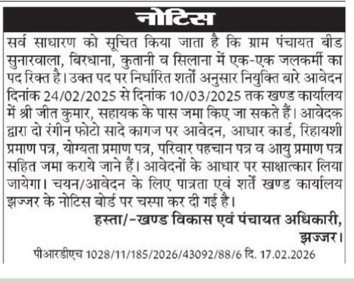 Haryana Tubewell Operator Vacancy 2026: खंड विकास एवं पंचायत अधिकारी झज्जर जिले के विभिन्न गांव में एक एक जलकर्मी भर्ती का नोटिफिकेशन जारी किया गया है। इच्छुक उम्मीदवार इस भर्ती के लिए 24 फरवरी 2026 से 10 मार्च 2026 तक ऑफलाइन माध्यम से आवेदन जमा करवा सकते हैं। इस भर्ती में उम्मीदवार का चयन बिना कोई लिखित परीक्षा इंटरव्यू के आधार पर किया जाएगा। इस भर्ती से संबंधित पूरी जानकारी नीचे दी गई है।