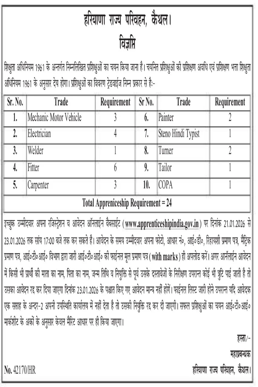 Kaithal Roadways Apprentice Vacancy 2026: हरियाणा राज्य परिवहन, कैथल डिपो में अपरेंटिस के विभिन्न पदों पर भर्ती का नोटिफिकेशन जारी किया गया है. जो भी अभ्यर्थी 10वीं और ITI पास है और हरियाणा रोडवेज में जॉब करना चाहते है वह अंतिम तिथि से पहले ऑनलाइन आवेदन कर सकते है। Kaithal Roadways Apprentice Vacancy 2026 के लिए ऑनलाइन आवेदन 21 जनवरी से 23 जनवरी तक कर सकते है।