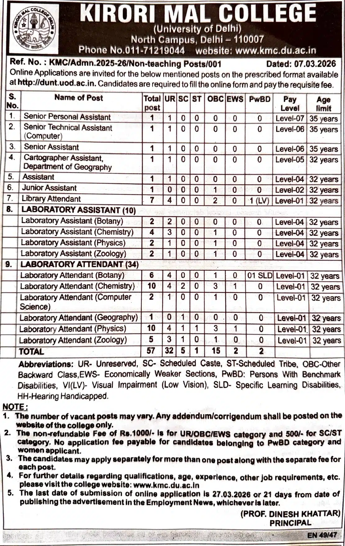 KMC Delhi Non Teaching Vacancy 2026: Kirori Mal College (KMC), University of Delhi has released the latest notification for 57 Non-Teaching posts including Senior Assistant, Junior Assistant, Laboratory Assistant, Library Attendant and Laboratory Attendant. The online application process starts on 07 March 2026, and the last date to apply is 27 March 2026. Eligible candidates can apply through the official website. All details related to this vacancy are given below.