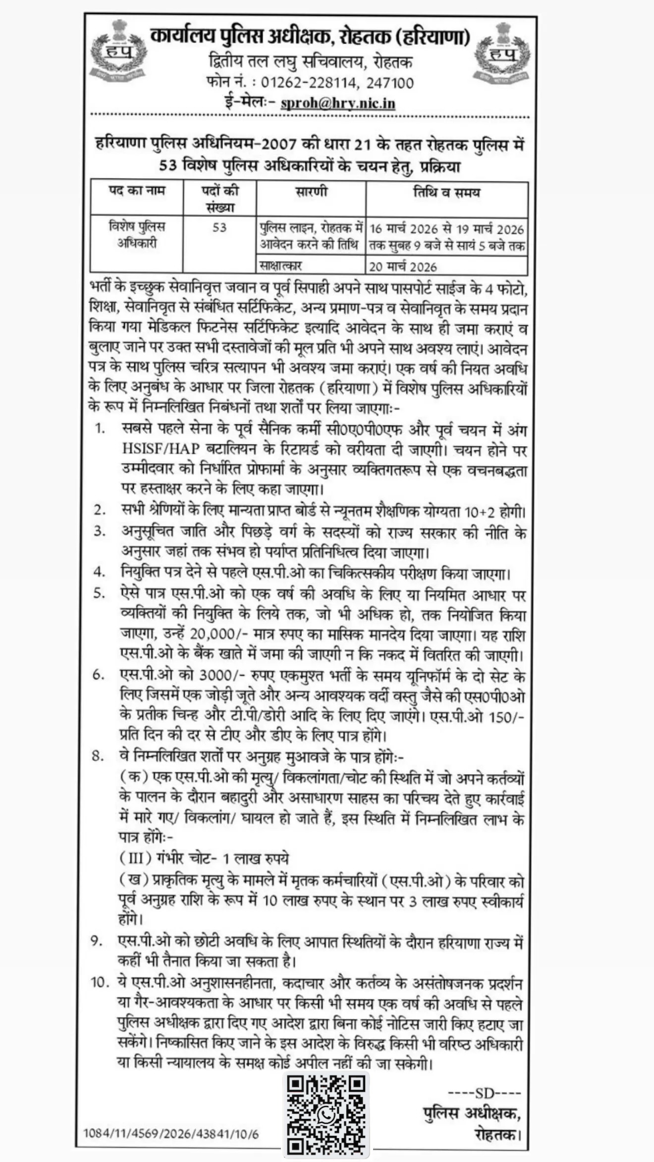 Rohtak Police SPO Recruitment 2026: Office of the Superintendent of Police Rohtak (Haryana) has released a notification for the recruitment of 53 Special Police Officer (SPO) posts. Eligible retired army personnel and ex-servicemen can apply for this recruitment. The application process will be conducted offline at Police Line Rohtak from 16 March 2026 to 19 March 2026 between 9 AM to 5 PM. All important details such as eligibility, salary, selection process and application process are given below.